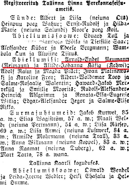 See aga tekitas minu peas igasuguseid kummalisi mõtteid. Segadust tekitas veel see, et minu ema nimetas oma isaks hoopis vanaema teist abikaasat Endlit. Endli perenimi oli Neuman. Vanaema uus st kolmas abikaas August oli millegi pärast ka Neuman. Ema oli Käfig ja Aino oli Vaidla. Üks paras pudru ja kapsad, kas pole? Ja keegi ei seletanud, nagu see kõik oleks mingi suurema tähtsusega riiklik saladus.