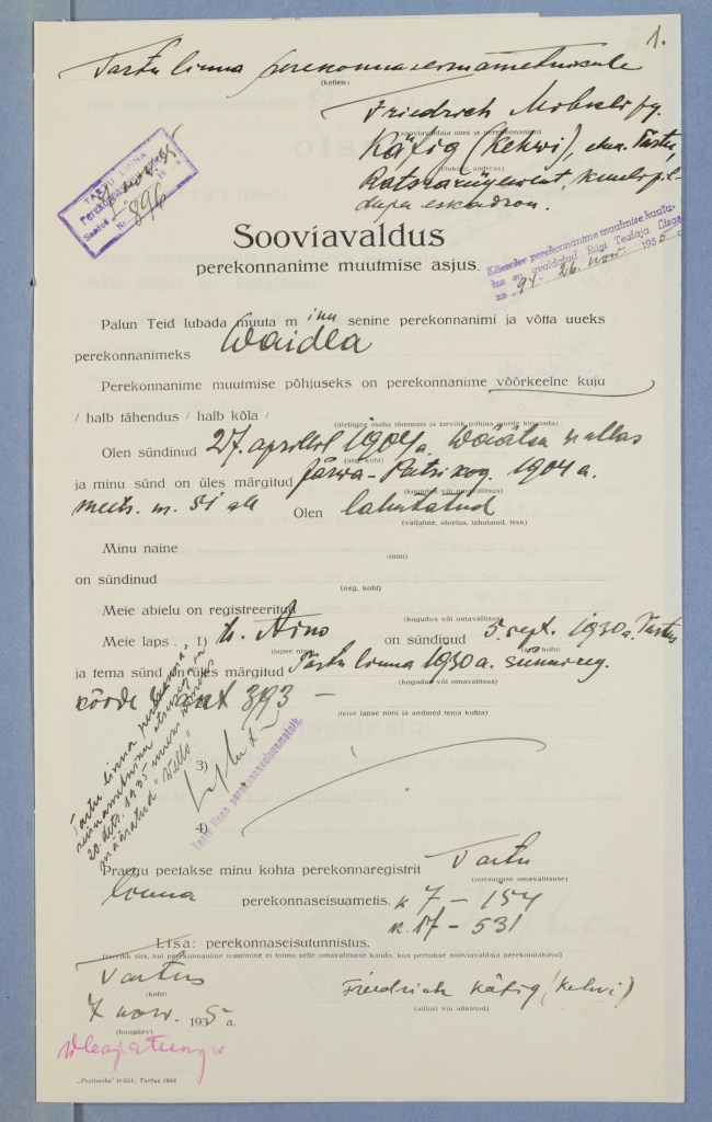 Miks aga olid lastel erinevad perenimed!? Aino määrati kohtuga Vellole. Vello vahetas oma nime 1935. aastal ja nii saigi Friedrich Käfig´igist Vello Vaidla ja temale määratud tütrest Aino Vaidla. Kuna Lia oli ema kasvatada ja Alide ei vahetanud perenime, enne abiellumist siis jäi Lia Käfig’iks.