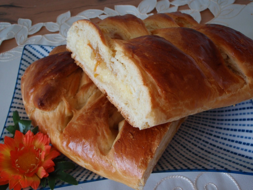 4. Tee taigna äärtesse sisselõiked. Tõsta lõigatud taignaribad ükshaaval taigna peale kokku nagu teeks patsi. Määri saiad munaga.