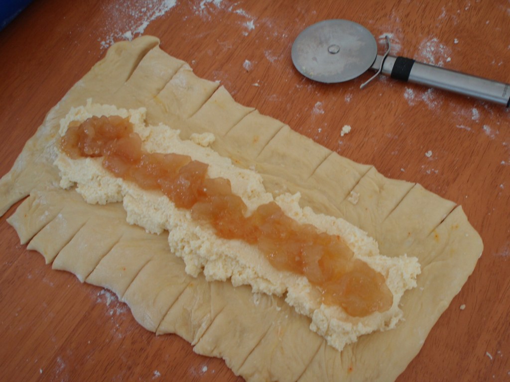 - Laota kohupiim taigna keskosasse nii et ääred jäävad vabaks. Tee kohupiima sisse vagu. Vakku pane moosi.