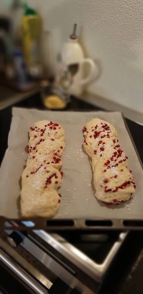 - Keeruta taignaribad omavahel ja vormi kringel või 2 stritslit. Määri munaga ja raputa peale raesokeri.