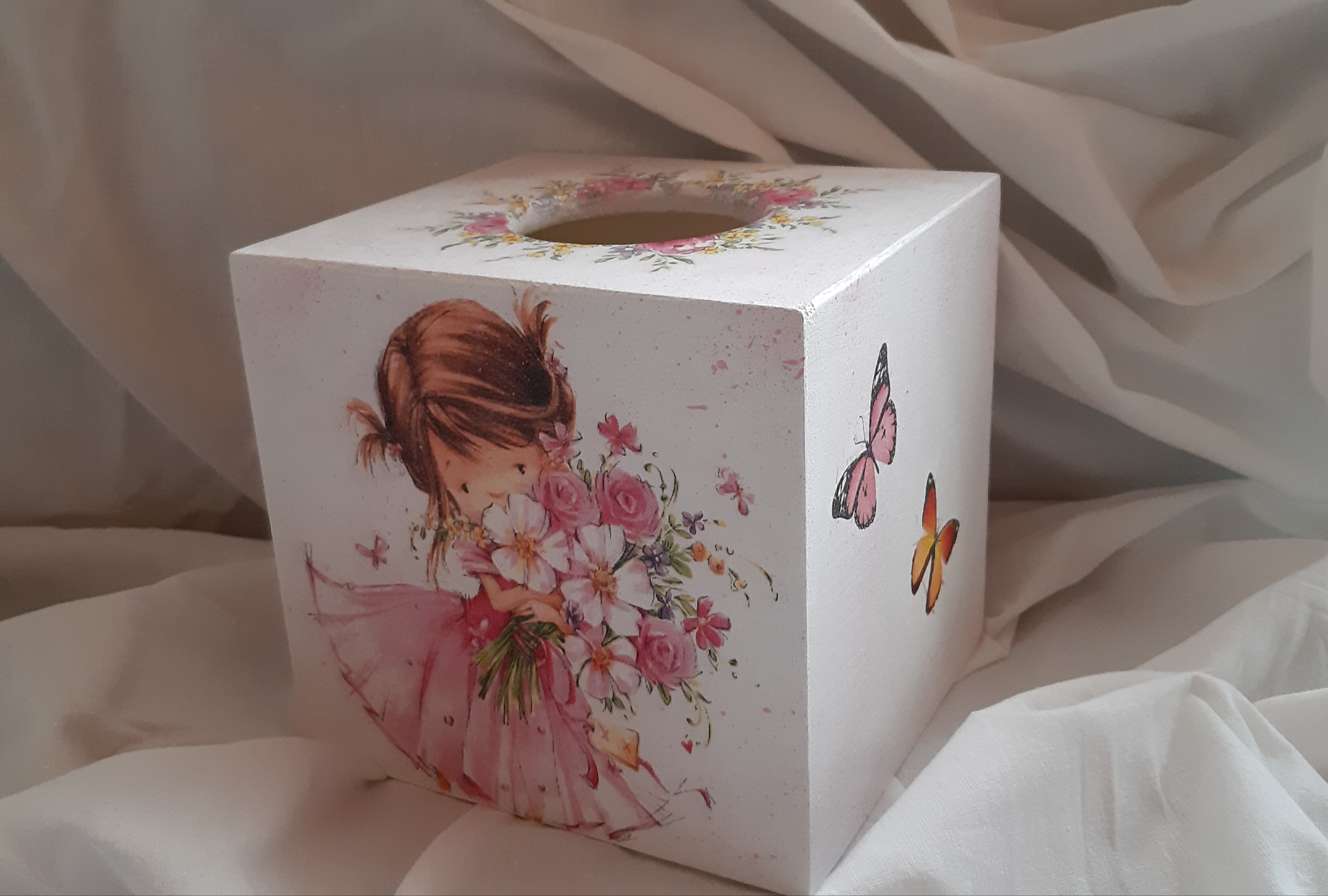 Roosa on 30 cm pikk. Tal on õhukesest roosast kangast kleit ja valge heegeldatud kampsun.