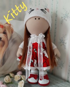Pikkus 34 cm. Jalad liiguvad, kätes on traat, seega saab ka käsi veidi teise asendisse panna. Kitty seljas on puuvillane kleit ja akrüül lõngast kootud kampsun. Peas on samast lõngast kootud, kiisu kõrvade ja näoga müts. Jalas on Kittyl beebi papudest tehtud kingad. Kitty riideid ja mütsi ära võtta ei saa.