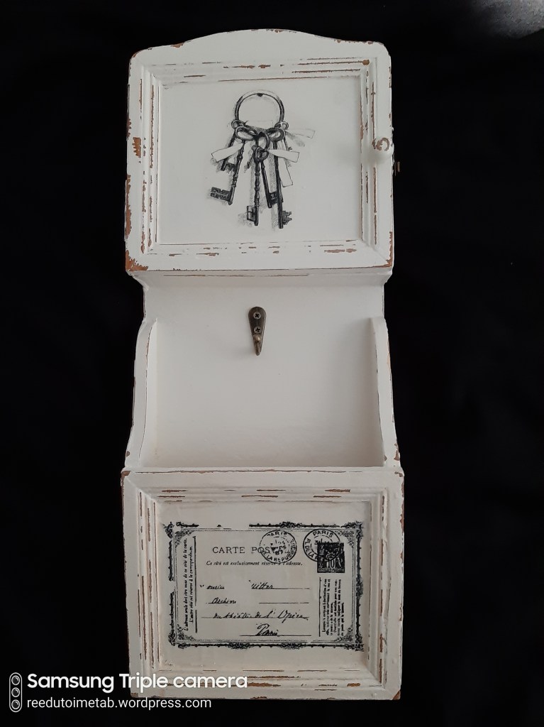 Karp on minu otsingute aastatest. Siis kui kõik oli põnev ja uus. Ja kõike tehnikaid tahtsin kohe, kohe katsetada. Nii sai karbile liimitud foto, mis on Pinterestist pätsatud. Ja loomulikult oli vaja krakleed ja struktuuri … kuna karp on nn pätsatud pildiga siis jäi see ju mulle ja nii võisin ka üle hea maitse piiri minna oma katsetamisega.